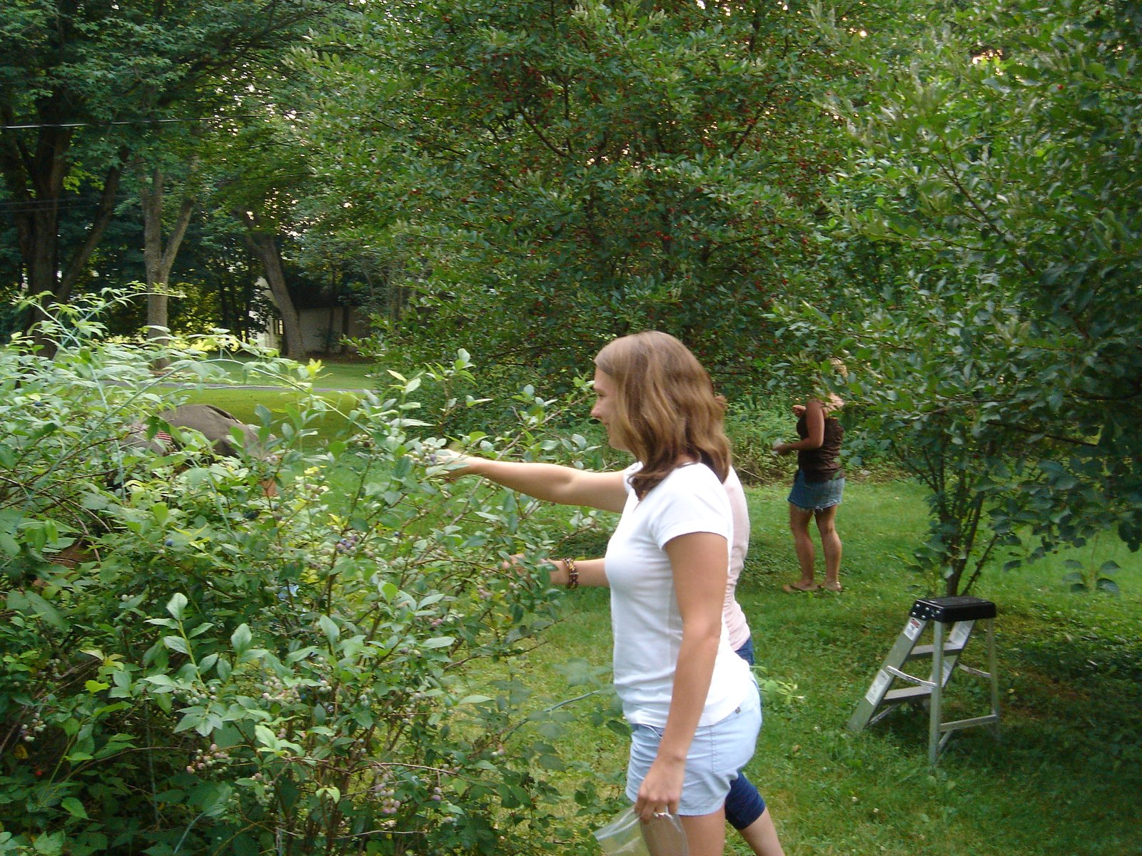 Cassandra and the other kids picking berries from My blueberry, raspberry and blackberry groves. I would get 4-5 gal of blueberries to freeze and would leave the rest for the birds.