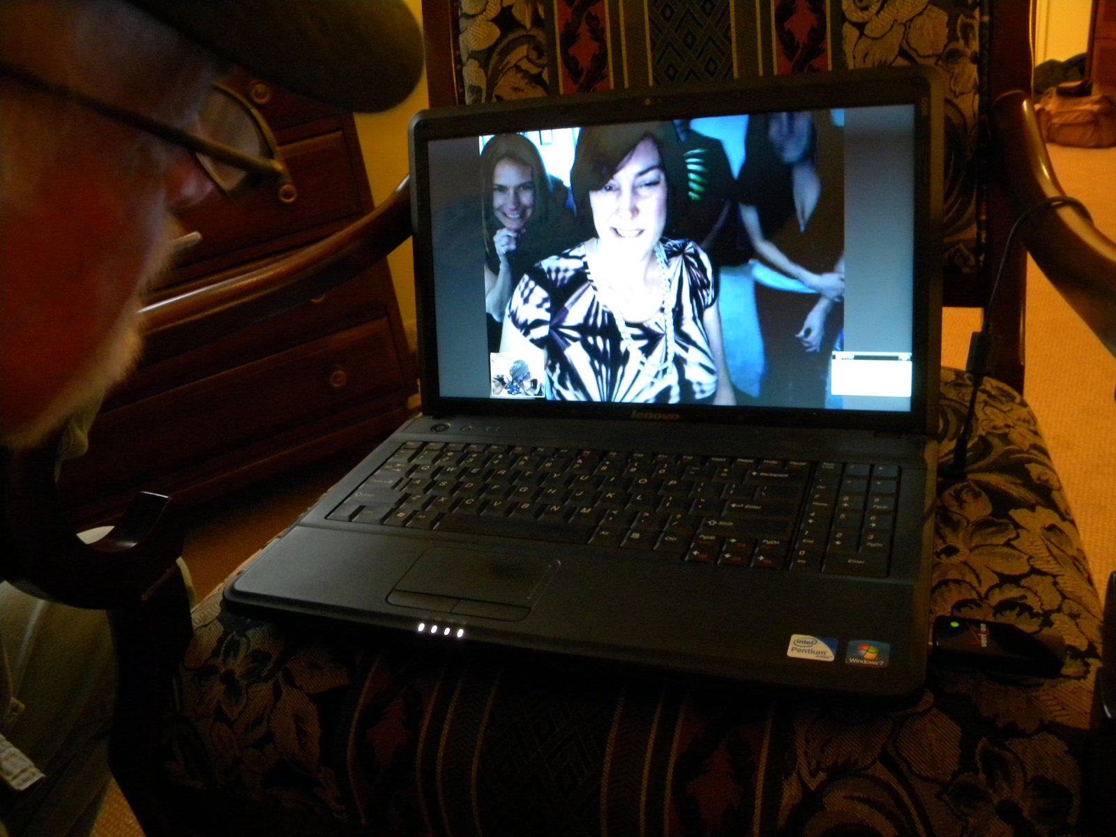 When Dad was in Elmcroft, I occasionally took a laptop to him, and a cell-phone based modem, to let him SKYPE with his grandkids and great grandkids in Texas and Denver. He is talking with Melissa in texas.