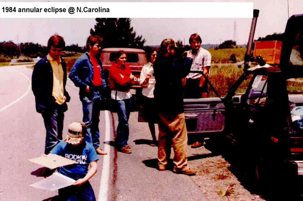 I decided to take my family to Richmond for the 1984 annular eclipse. At Richmond it was raining and raining. So i got the fam up and we started heading south and west. As the clouds broke I noticed a police car behind me with lights on. He had seen my eclipse sign and gave us an escort to where we watched it. He must have called others because about 20 other people joined us. But horror! I left my telescope tripod in my garage back home. Luckily someone had duct tape and i managed totape the scope to the roof of my car in a way that it projected the ground on a screen.