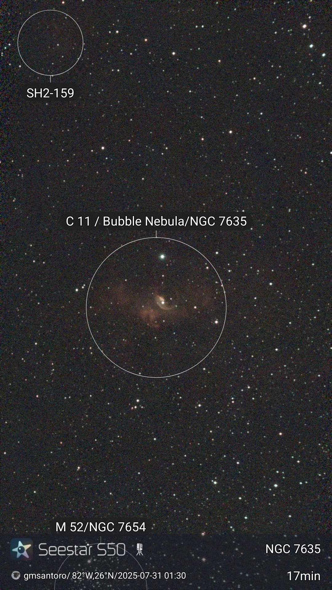 NGC 7635 – The Bubble Nebula & Sh2-159 NGC 7635, famously called the Bubble Nebula, is a striking emission nebula in the constellation Cassiopeia, lying about 7,100 light-years away. The “bubble” itself is a shell of glowing gas, blown by fierce stellar winds from a massive, hot O-type star (SAO 20575) at its center. The nebula spans roughly 7 light-years, with brilliant arcs of hydrogen and oxygen emission outlining the bubble against a backdrop of interstellar clouds. Nearby is Sh2-159, a diffuse H II region that glows from the ionization of hydrogen gas by clusters of young stars. The two objects together showcase the raw power of stellar birth and death, with winds and radiation sculpting the surrounding interstellar medium. The Bubble Nebula shines at an apparent magnitude of ~10, making it a challenge visually but an extraordinary astrophotography target.