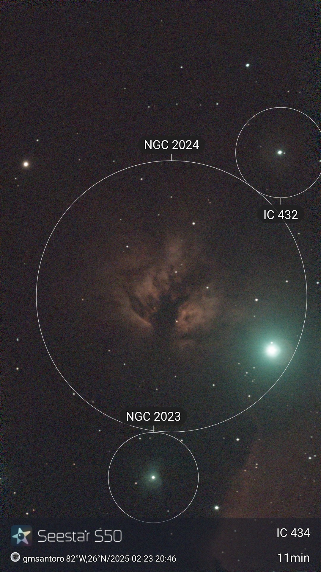 NGC 2024, IC 432, and NGC 2023 This rich region of Orion, about 1,300 light-years away, contains several striking nebulae shaped by star birth and starlight. The largest and brightest is NGC 2024, the Flame Nebula, whose fiery glow comes from hydrogen gas ionized by the nearby star Alnitak, with dark dust lanes silhouetted across its light. Behind the dust, a young open cluster of stars is still forming. Nearby lies IC 432, a small and faint reflection nebula of magnitude ~13, which shines by reflecting the light of nearby stars and adds subtle contrast to the bright Flame. Completing the trio is NGC 2023, one of the brightest reflection nebulae in the sky (magnitude ~10), glowing blue from the light of its hot central star HD 37903. This nebula is especially important to astronomers as it contains brilliant emission features from molecular hydrogen, offering a close look at the physical processes of star formation. Together, these three nebulae form a spectacular tapestry of glowing gas and dust in Orion, showcasing both the power and delicacy of stellar creation.