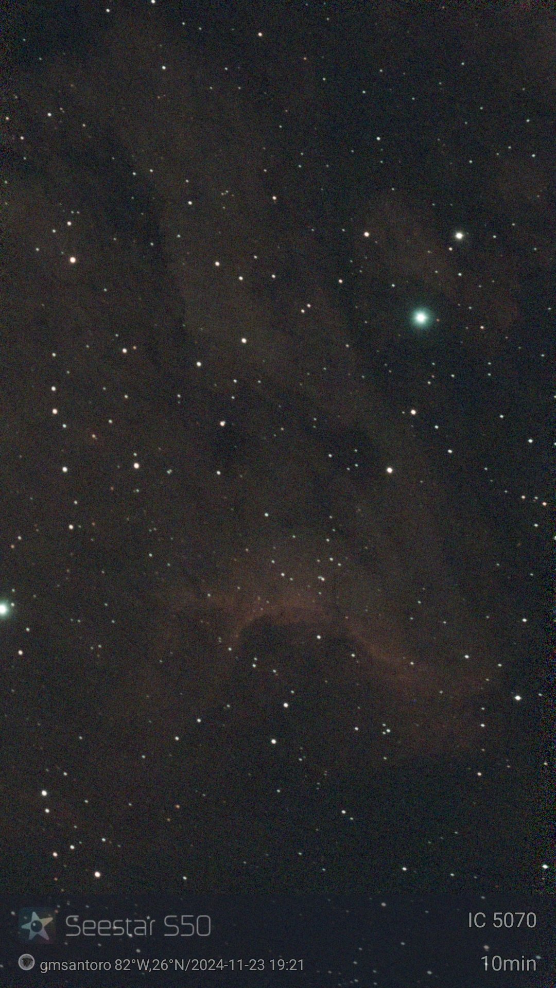 IC 5070 – The Pelican Nebula IC 5070, known as the Pelican Nebula, is a large emission nebula in the constellation Cygnus, lying about 2,000 light-years away. Its nickname comes from its resemblance to a pelican in wide-field images. The nebula is part of the same vast star-forming complex as the North America Nebula (NGC 7000), with both separated by a dark band of interstellar dust. The Pelican Nebula is especially rich in areas of active star formation. Ultraviolet radiation from nearby hot stars ionizes the hydrogen gas, causing it to glow red, while powerful stellar winds carve out intricate ridges and dark, finger-like clouds known as “elephant trunks.” These structures are collapsing under their own gravity and giving rise to new generations of stars. With an apparent magnitude of about 8.0, IC 5070 is too faint to see unaided, but its detailed structure makes it a favorite astrophotography subject and a striking companion to the North America Nebula.