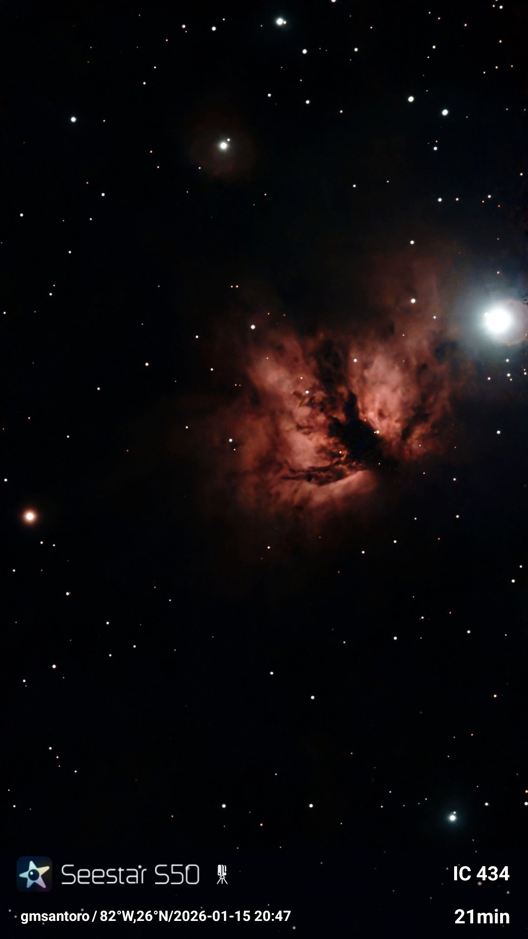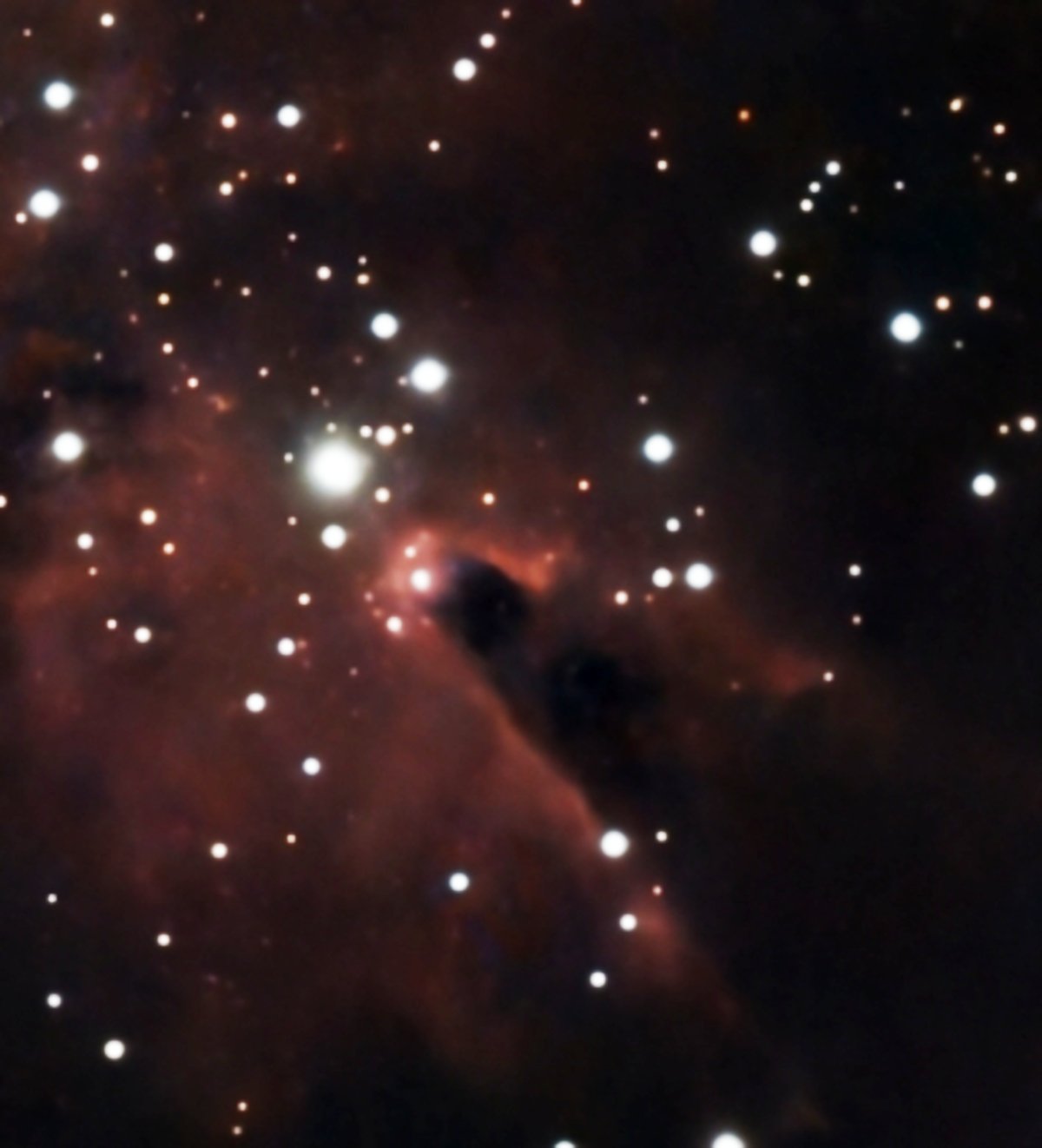 IC 434 – The Horsehead Nebula Region IC 434 is a long ribbon of faint emission nebula in the constellation Orion, about 1,500 light-years away. It is best known as the glowing red backdrop against which the Horsehead Nebula (Barnard 33) is silhouetted. The nebula’s light comes from hydrogen gas ionized by the nearby bright star Sigma Orionis, creating a diffuse crimson glow that stretches south of Alnitak, the easternmost star in Orion’s Belt. The striking contrast between IC 434’s gentle red glow and the dark dust cloud of the Horsehead makes this region one of the most iconic sights in the night sky. Although the nebula itself has an apparent magnitude of about 7, its surface brightness is very low, making it difficult to observe visually. In astrophotographs, however, IC 434 reveals its true richness, serving as the stage upon which the Horsehead Nebula stands out in silhouette.