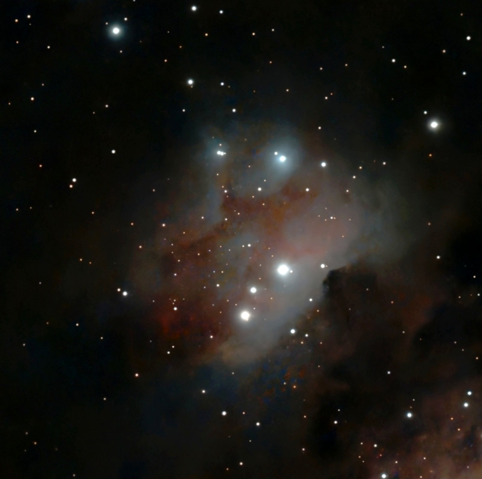 NGC 2071 NGC 2071 is a bright reflection nebula in the constellation Orion, located about 1,350 light-years away. It lies just north of the famous Orion Nebula (M42) and is part of the larger Orion Molecular Cloud Complex, one of the richest star-forming regions in the Milky Way. The nebula glows with a soft bluish light as it reflects radiation from the young, hot stars embedded within it, most notably the pre-main-sequence stars and protostars still forming inside dense molecular gas. Astronomers study NGC 2071 closely because it contains powerful outflows and jets from newborn stars, visible in both optical and infrared observations. These outflows carve channels in the surrounding material, revealing the dramatic processes of stellar birth. With an apparent magnitude of ~8, the nebula is faint but accessible in medium telescopes, while long-exposure photography reveals its complex interplay of dust, gas, and starlight. Together with neighboring nebulae like NGC 2068 and M78, NGC 2071 forms part of a striking chain of reflection nebulae in Orion.