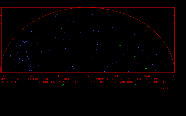 Skyplot was an astronomy simulation software that allowed users to visualize the night sky on their computer. The original version, developed by Gerald M. Santoro, was released in 1987 for MS-DOS. It is often referred to as "The Planetarium Simulator" and enabled users to generate star maps and explore celestial objects.