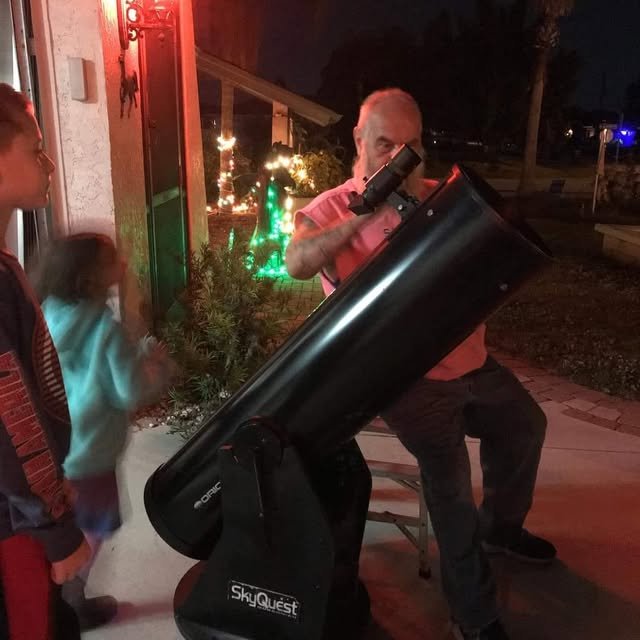 Me showing Logan a comet through my 10" dobsonian telescope.